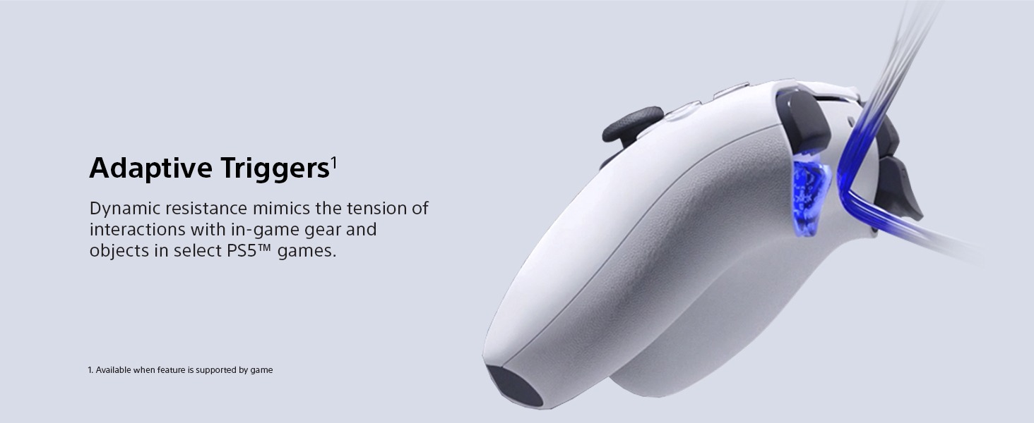 • Haptic Feedback: Experience haptic feedback via the DualSense wireless controller in select PS5 titles and feel the effects and impact of your in-game actions through dynamic sensory feedback. Adaptive Triggers: Get to grips with immersive adaptive triggers, featuring dynamic resistance levels which simulate the physical impact of in-game activities in select PS5 games.